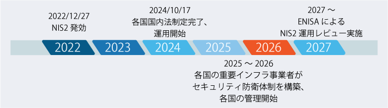 昨今、AI技術の進化によりサプライチェーン攻撃は非常に巧妙化しています。ターゲットへ直接攻撃するのではなく、踏み台としてセキュリティ対策が脆弱な子会社、関連企業、取引先などが集中的に狙われています。これらの巧妙化した手口に対応するため、セキュリティ対策が各国の重要課題となっていて、法規制が次々と進められています。EUでは、加盟国間でのサイバーセキュリティに関する規制や基準が異なり、多国間でのサプライチェーンのセキュリティ安全が確保できていませんでした。2016年にサイバーセキュリティに関する欧州初の法律として NIS指令(ネットワークおよび情報システム指令) が成立しました。NIS2指令は、NIS指令を改訂したもので、ネットワークや情報システムを利用する幅広い業界に対し、業種や企業規模が拡大されました。主な目的は、EU加盟国のサイバーセキュリティの強化、リスク対策やインシデントへの対処能力に関し、一定水準のレベルを確立し、EU 加盟国のサイバーレジリエンス(サイバーインシデントからの回復力)を向上させることにあります。国境を越えるサイバー攻撃に迅速に対応できる体制、特に社会的・経済的に重要な役割を担うインフラや企業に対して、リスクの軽減と対応の能力向上が求められています。