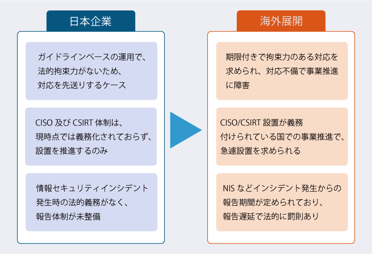 そのため、日本の対応力のある大手企業ではなく、サプライチェーンに属する中小企業では、日本国内の基準で対応を進めていると、海外のプロジェクトに参画する際の要求レベルの高さを達成できないという可能性があります。いずれ日本の法律も順次法的拘束力のあるものになるといわれていますが、当面はこのギャップには注意が必要です。