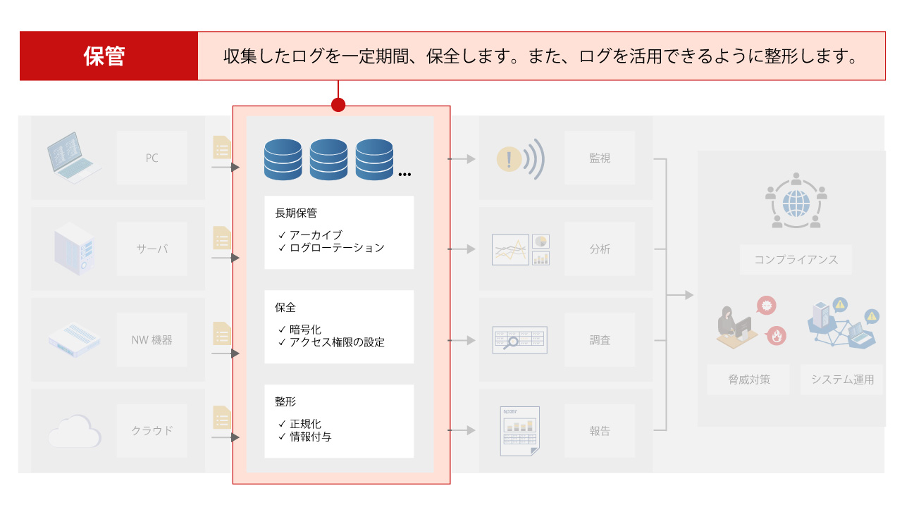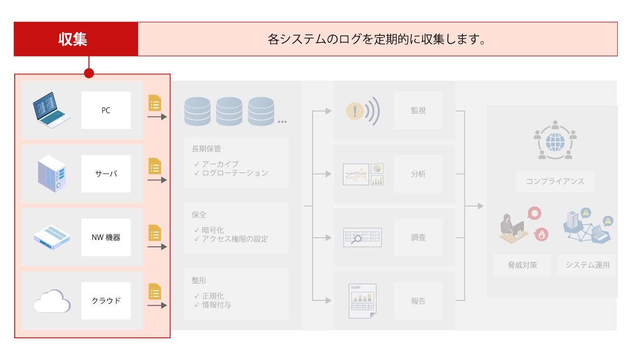 - 保全:暗号化やアクセス権限の設定により、攻撃者によるログの改ざん・削除を防ぐ