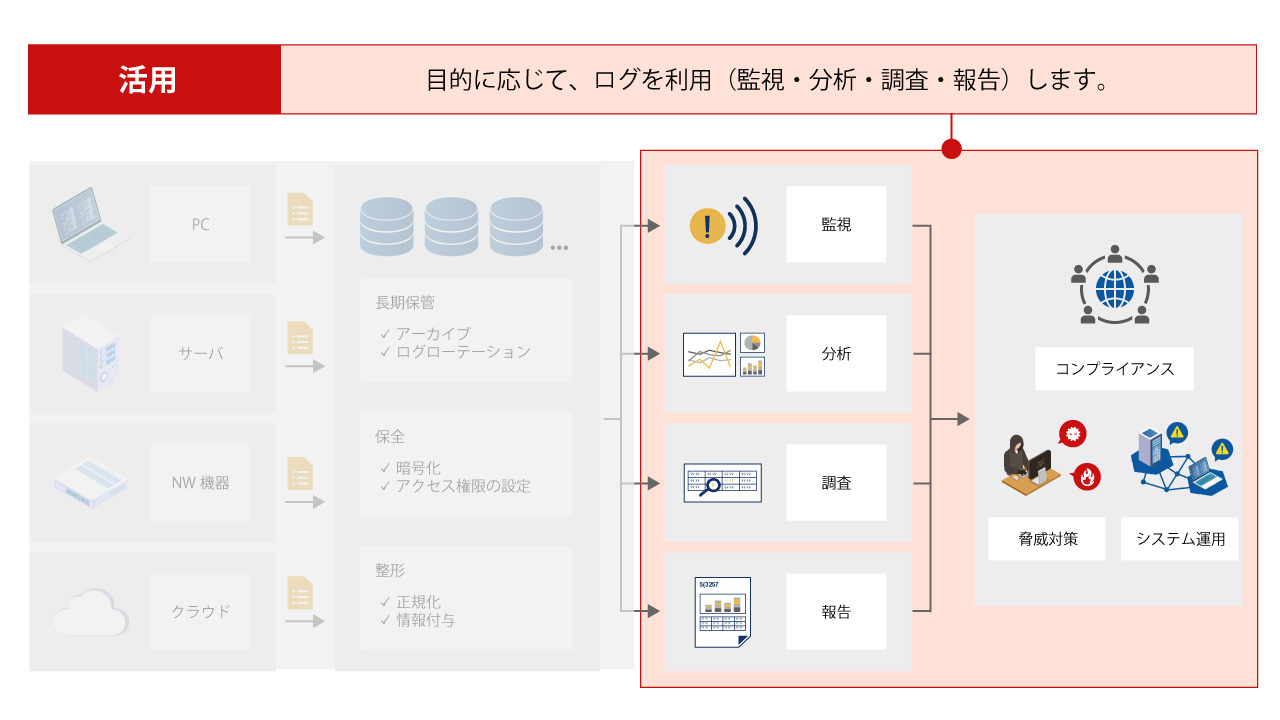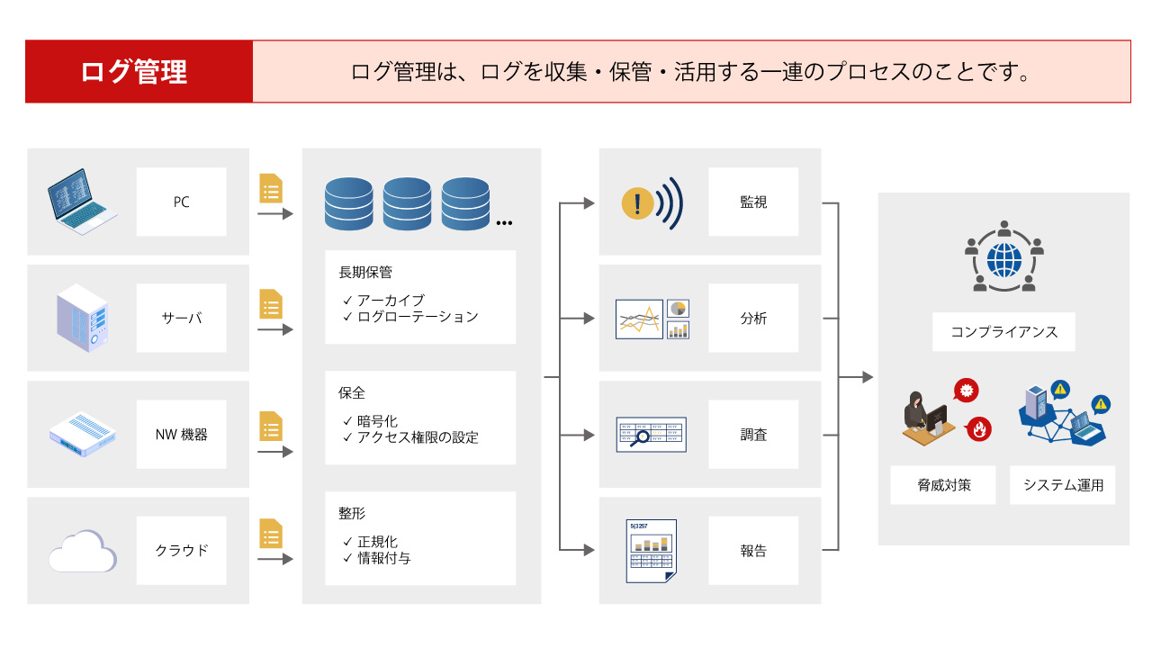 こうした背景のもと、必要なときにログを確実に活用するためには、日頃からログを管理しておくことが重要です。