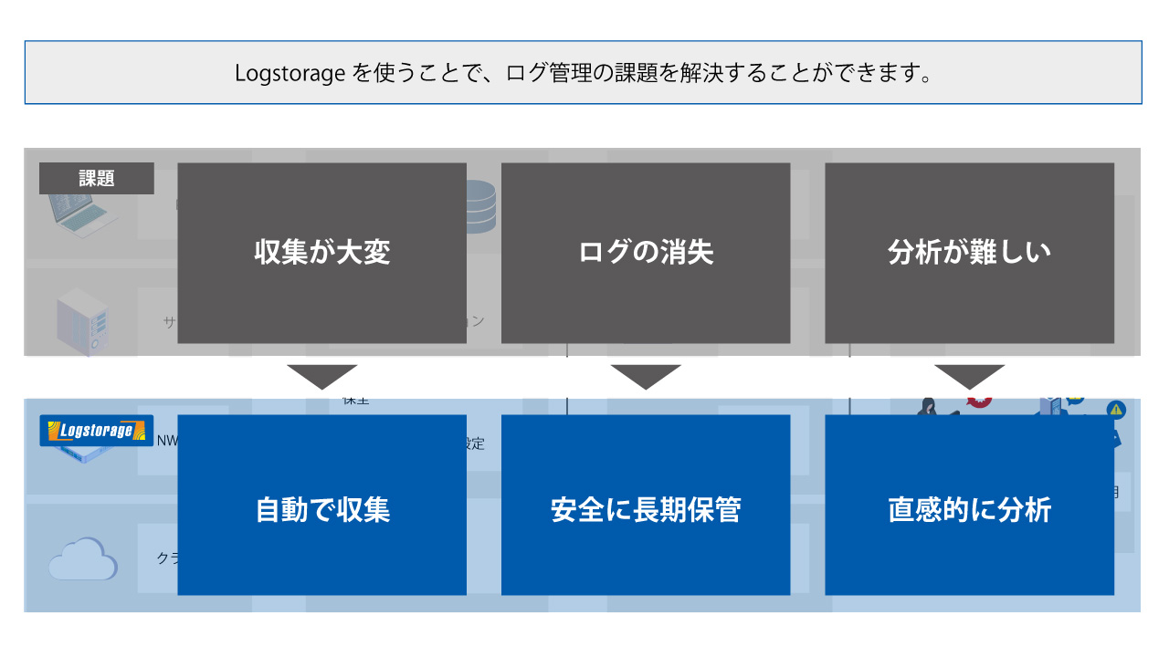 このように、ログの収集・保管・活用の各プロセスで、いくつもの課題が生じます。こうした課題を解決するための製品として、SIEM・統合ログ管理システム「Logstorage」をご紹介します。