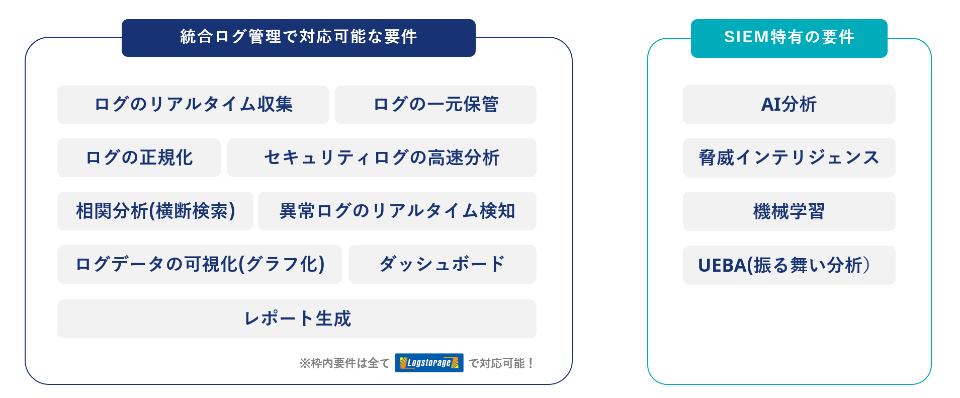 SIEMという言葉は広い意味で使われることが多く、実際にはSIEMの要件とされる機能の多くが統合ログ管理でも実現可能です。以下の図では、SIEMの主な要件を整理し、「統合ログ管理で対応可能な機能」と「SIEM特有の機能」に分類しています。