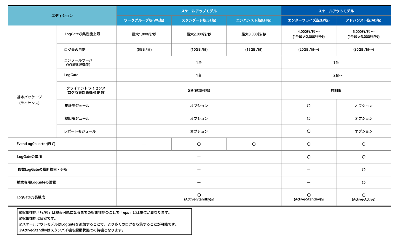 Logstorageはログの収集量に応じて製品体系を5種類用意しています。