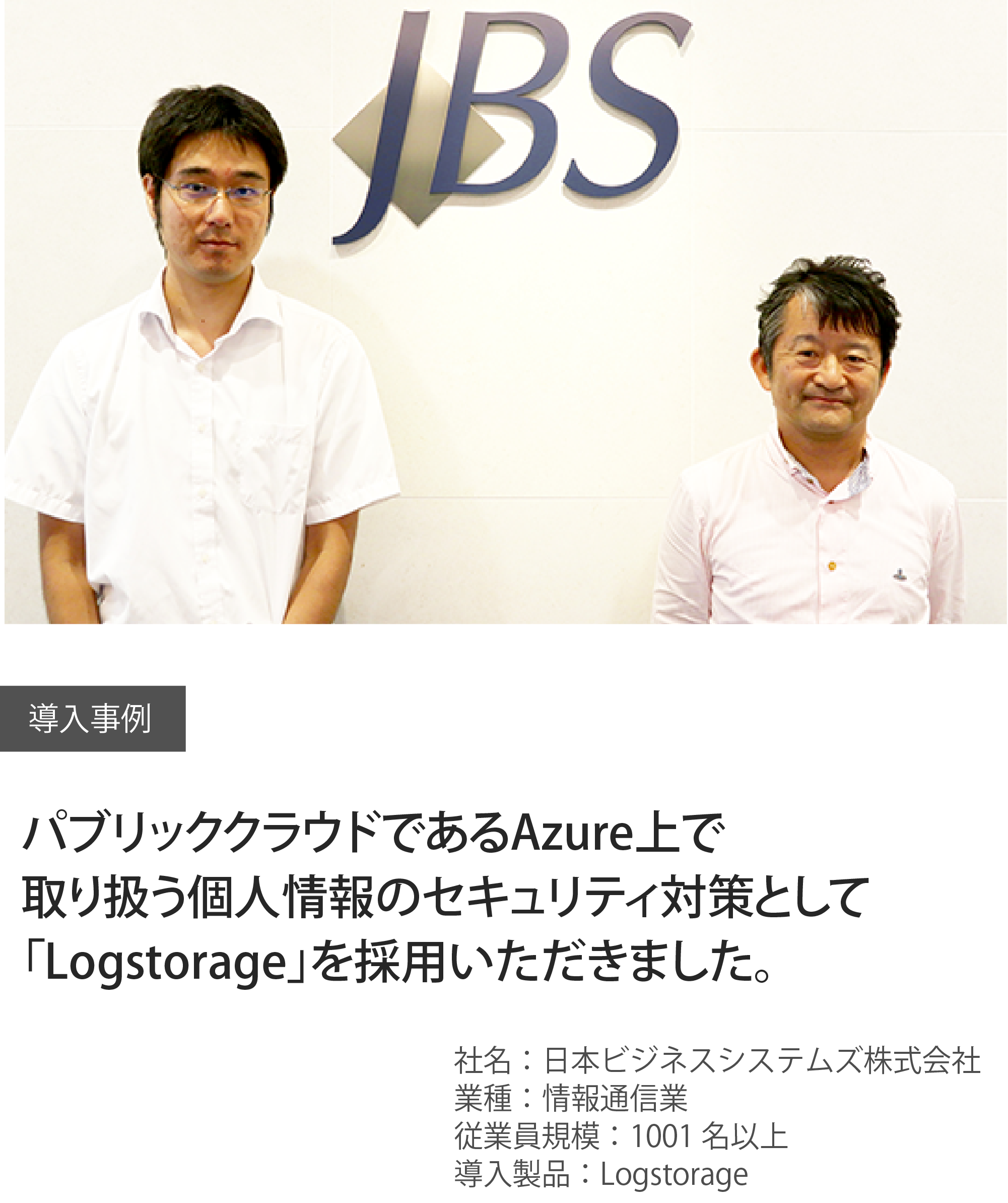 日本ビジネスシステムズ株式会社(以下、JBS)は、独立系システムインテグレーターとして、高レベルのITサービスを提供する企業です。2015年に弊社の販売・構築パートナーでもある株式会社イーセクター(以下、イーセクター)からの紹介により、パブリッククラウドであるAzure上で取り扱う個人情報のセキュリティ対策として「Logstorage」を採用いただきました。製品選定から構築、運用まで携わったJBS松方様 岩崎様とイーセクター営業担当の小村様にお話を伺いました。
