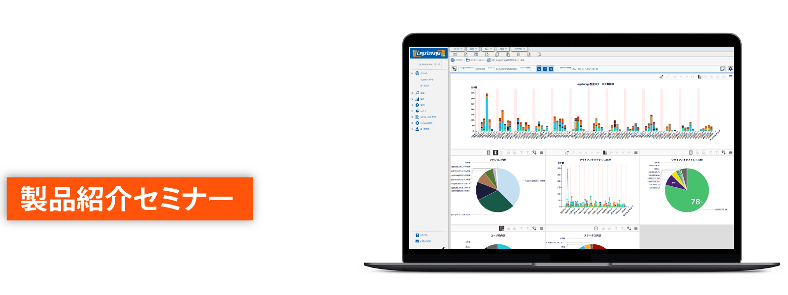 本セミナーは、Logstorageの製品紹介をご覧いただけます。実際の製品のデモ画面・デモ操作をご覧いただきながら、Logstorageの主要な分析機能の操作感(検索・集計・検知・レポート・インサイト分析)をイメージいただけます。